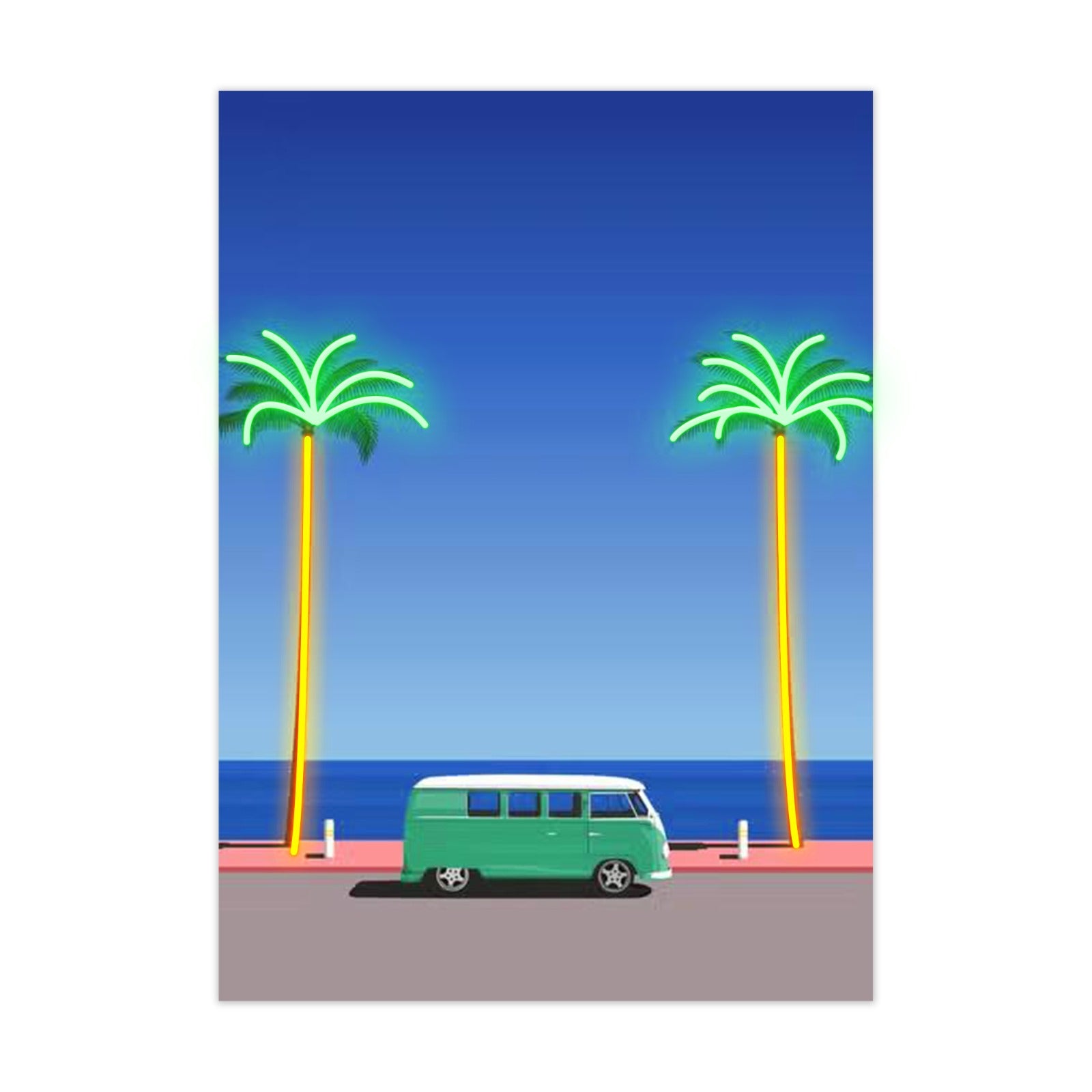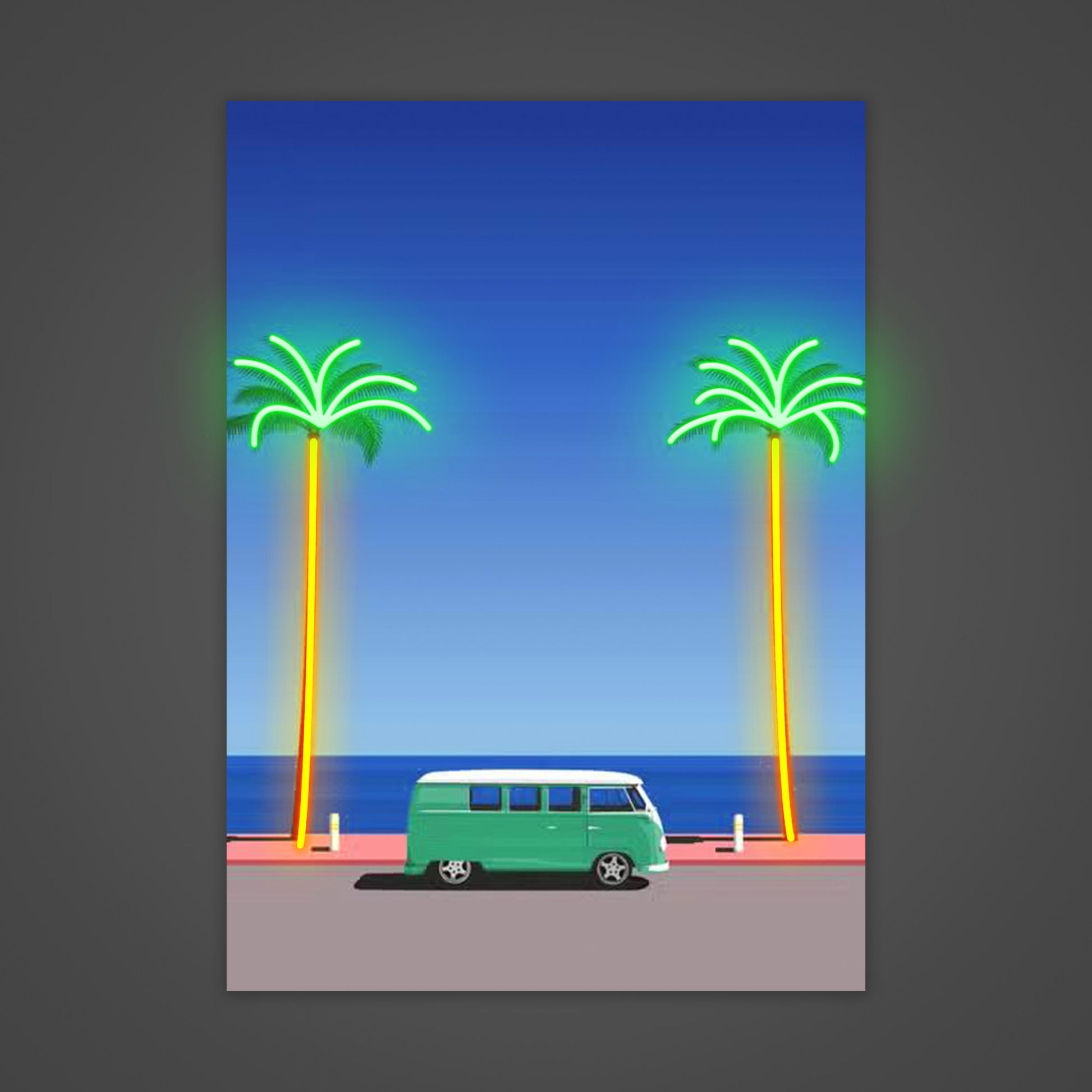 Un vieux Combi VW vert menthe stationne face à l’océan, deux palmiers géants s’élèvent vers un ciel bleu infini… et quand la lumière s’éteint, la magie opère : les troncs s’illuminent d’un jaune doré solaire et les feuilles explosent en vert néon électrique. La route infinie de la Pacific Coast Highway se met à vibrer, comme si le soleil ne s’était jamais vraiment couché.