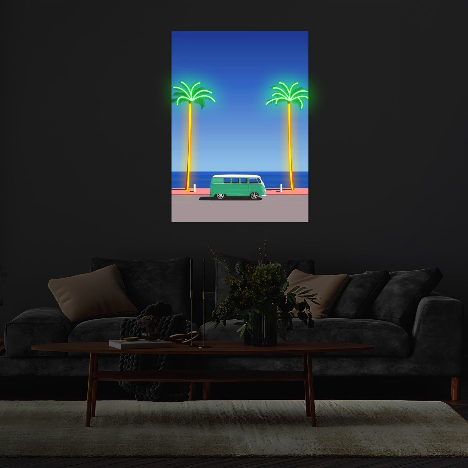 C’est l’été éternel, la liberté 70’s, les soirées surf et les road-trips sans fin, capturés dans un tableau qui transforme n’importe quelle pièce en bord de mer californien une fois la nuit venue.